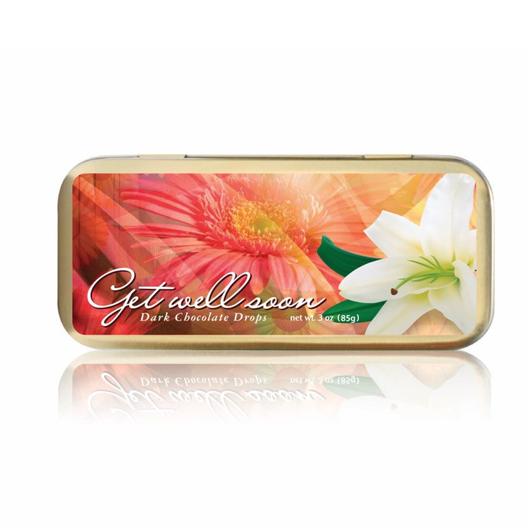 Indulge in our 3oz Get Well Soon gourmet dark chocolate tin. Made with rich, decadent dark chocolate, this treat is sure to lift anyone's spirits during recovery. A thoughtful gift to wish someone a speedy recovery.