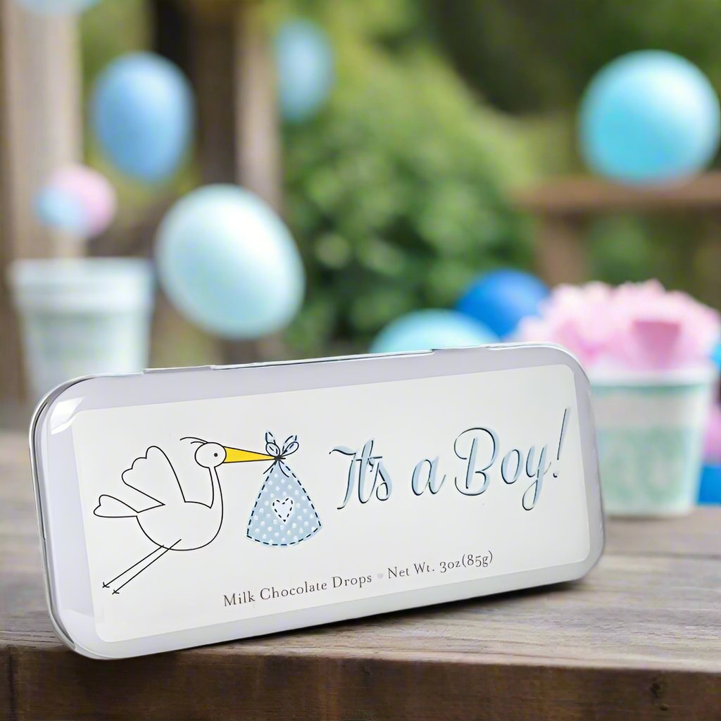 Welcome a new little one with a sweet treat. This It's a Boy gourmet milk chocolate tin is the perfect way to celebrate. Made with high-quality ingredients, this 3oz tin is a delicious and playful way to welcome the new arrival. (No storks were harmed in the making of this chocolate.)